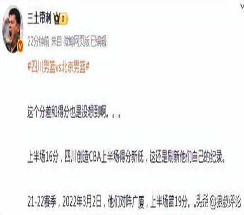 根据媒体人“三土带刺”发文点评:“上半场16分,四川创造CBA上半场得分新低,这还是刷新他们自己的纪录。
