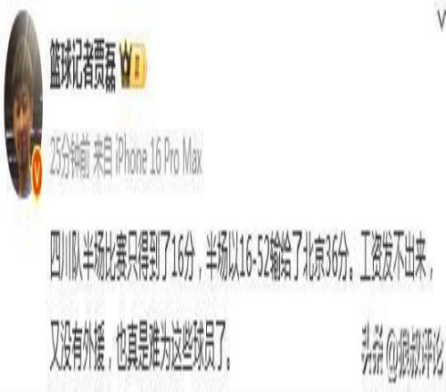篮球记者贾磊发文:四川队半场比赛只得到了16分,半场以16-52输给了北京36分。工资发不出来,又没有外援,也真是难为这些球员了。