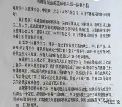 联名信中,四川男篮全体成员表示他们遭遇欠薪3至9个月不等,且有部分奖金未发放,社保更是有28个月未交!